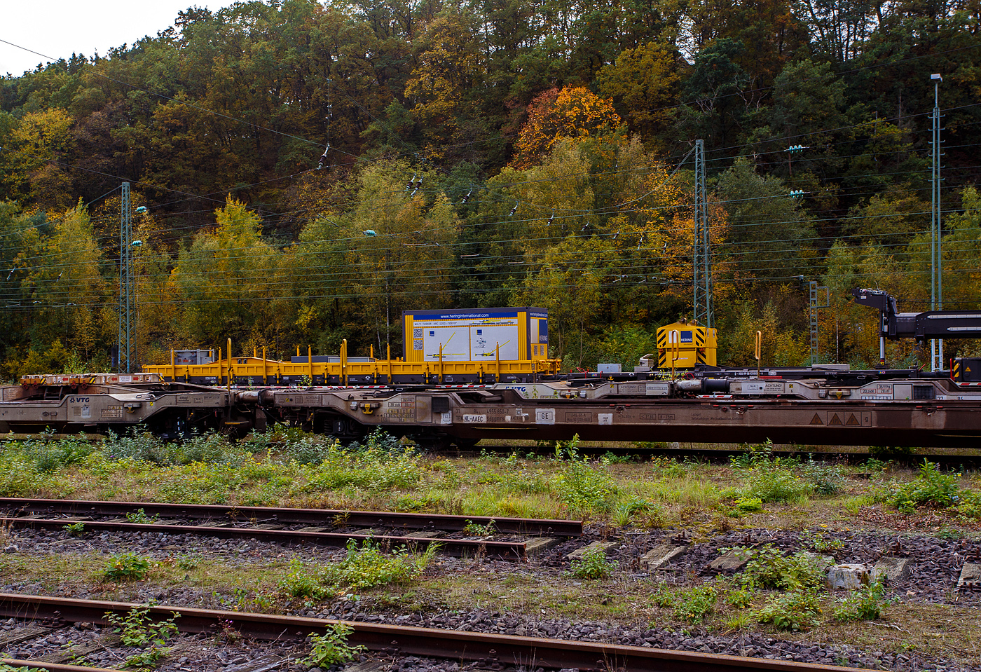 Dahinter noch ein vierachsiger Drehgestell-Flachwagen, Nummer unbekannt, der Gattung Res als Kran-Schutzwagen gegenlastseitig, u. a, beladen mit Werkstattcontainer, kleine Traversen, Anschlagmittel und sonstiges Zubehör/Equipment.