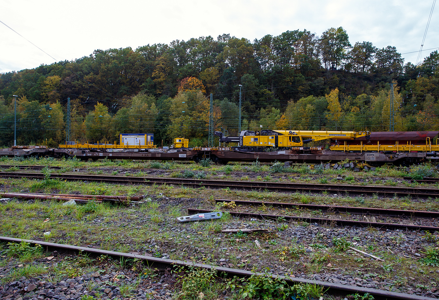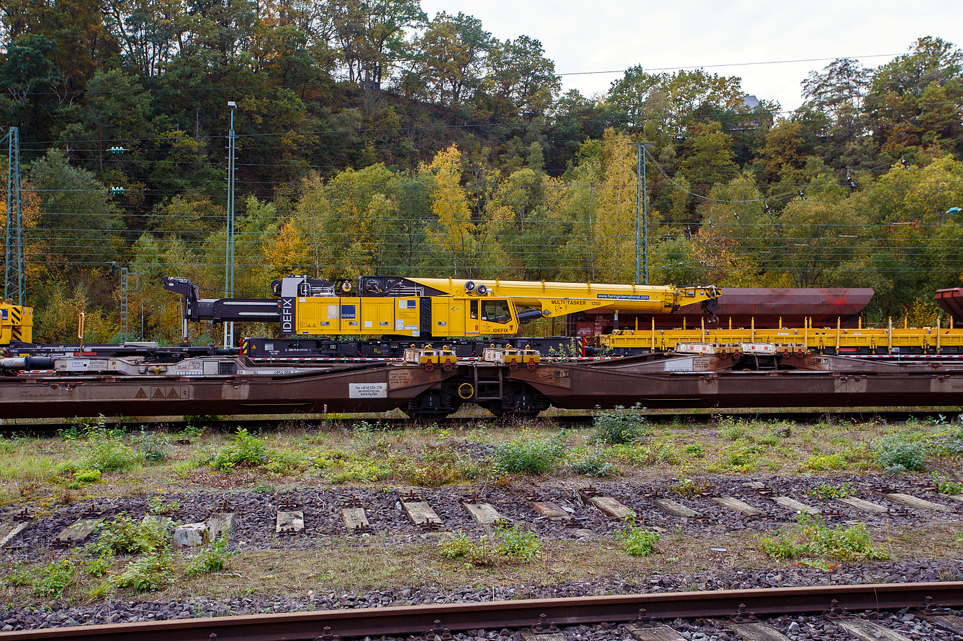 Der 150 t Gleis- und Eisenbahndrehkran (EDK) KIROW Multi Tasker KRC 1200, D-HGUI 99 80 9419 041-5 „IDEFIX“ der HERING Bahnbau GmbH in Burbach-Holzhausen, ist am 19 Oktober 2025 im Rbf Betzdorf/Sieg abgestellt. Leider stehen noch auf den Gleisen davor andere Wagen. Nach der Gewichtsklasse hätte der Kran eher den Namen „Obelix“ verdient und nicht den Namen nach Hund von Obelix „Idefix“.